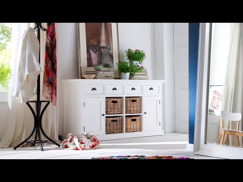This buffet or sideboard brings effortless storage and quiet elegance to any room, from the dining area to the home office. Hand woven kubu rattan baskets and fixed shelving behind shaker style doors keep linens, serveware or everyday essentials neatly organized. The wide top offers a serene place to display treasured pieces, from portraits and books to a favourite lamp.